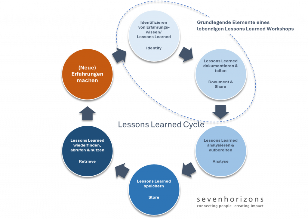 Erfahrungslernen bzw. Lessons Learned beginnen niemals mit und enden niemals in einem Workshop. Vielmehr sollte ein solcher Workshop immer in einen Prozess des Erfahrungslernens eingebettet sein, um Wirkung zu zeigen.