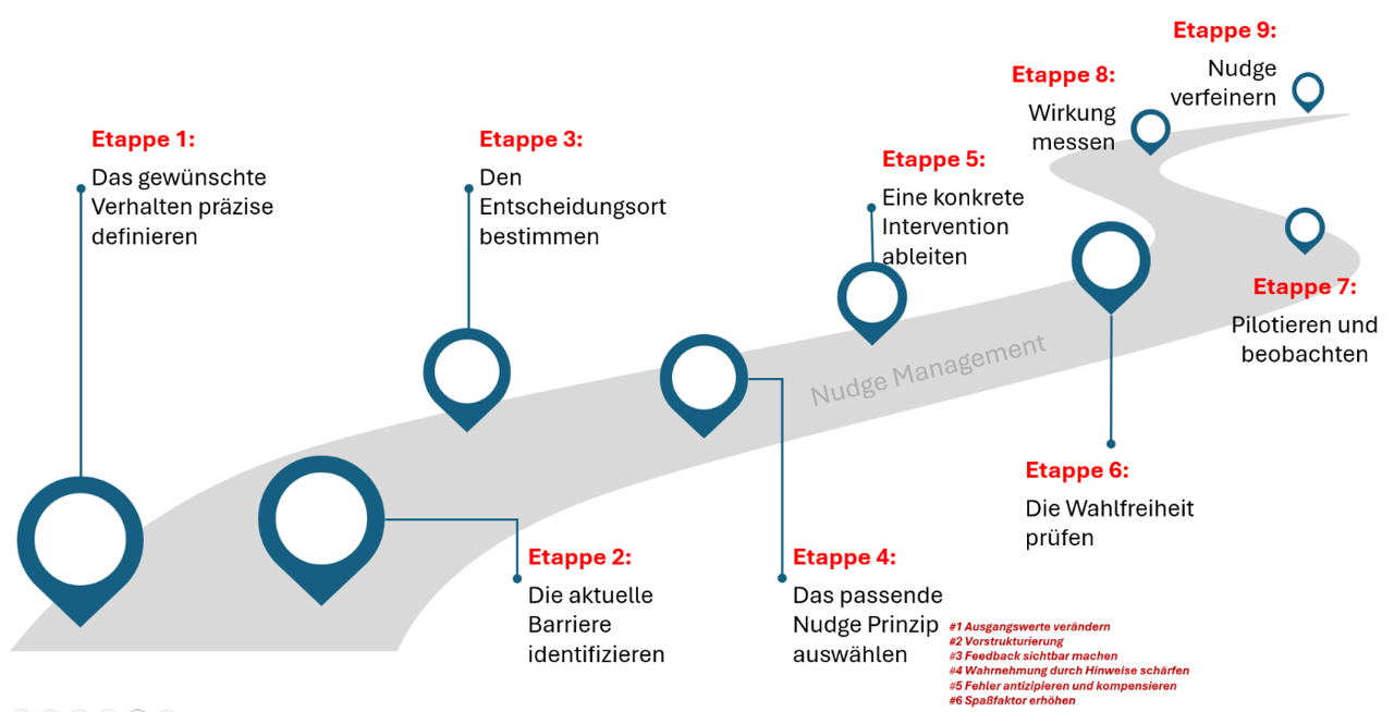 Die entwickelten Nudges werden nicht isoliert betrachtet, sondern in ihren Umsetzungskontext eingebettet. Wer setzt sie um, wann greifen sie, woran zeigt sich Wirkung, wie wird nachgeschärft.