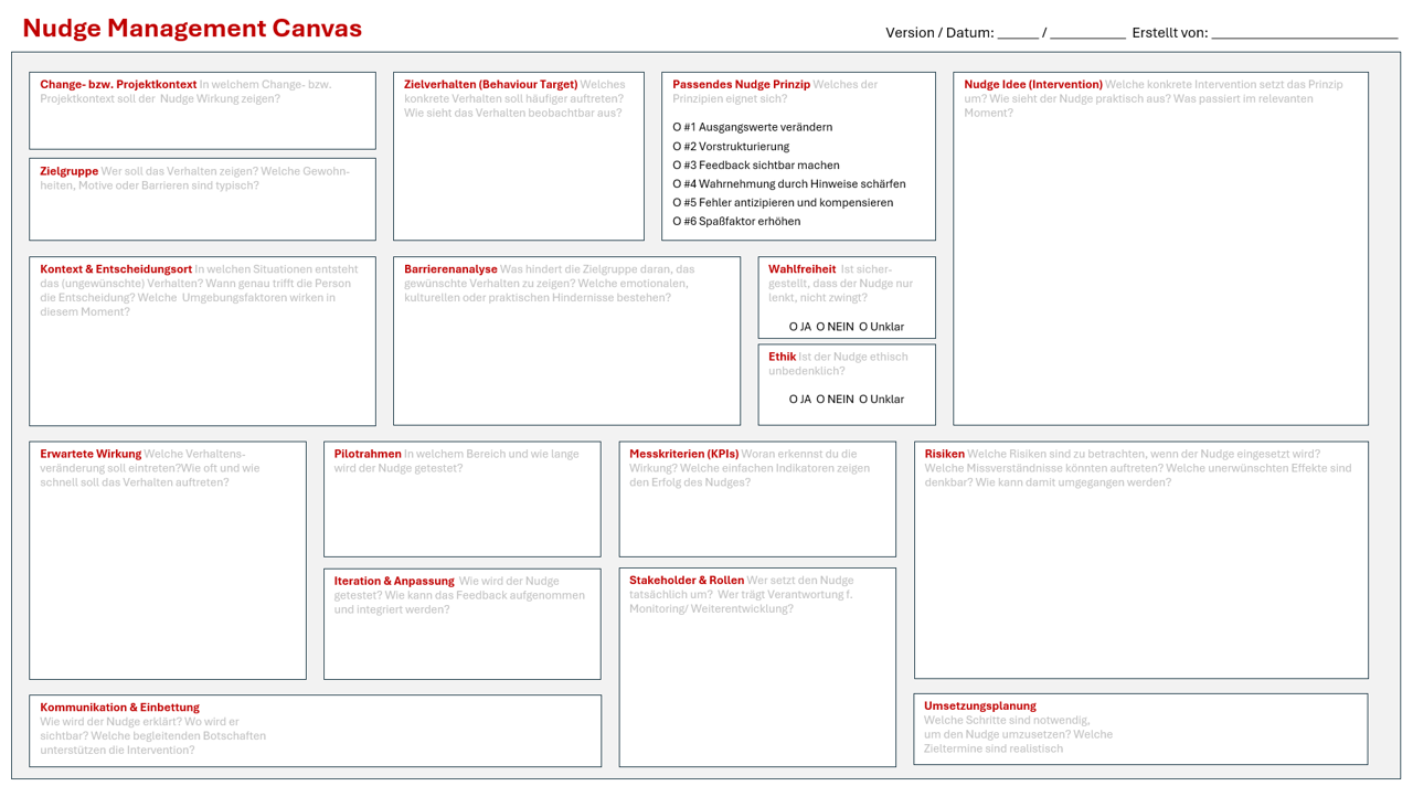 Zur Strukturierung und Dokumentation wird ein Nudge Management Canvas eingesetzt. Er verbindet Zielverhalten, Wirkmechanismen, Nudge-Ideen und Umsetzungsbedingungen in einem gemeinsamen Bild.